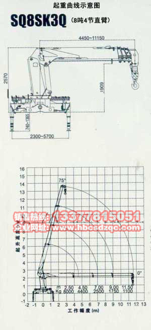 SQ8Z3Q噸四節(jié)折臂吊機(jī)(舉升高度13米 ,工作半徑9.86米) 最大起重量是8T,最小起重量是1.25噸 SQ8SK3Q噸四節(jié)直臂吊機(jī)(舉升高度13.5米 ,工作半徑11.5米) 最大起重量是8T,最小起重量是1.1噸